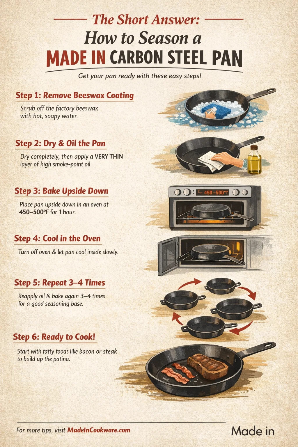 Untuk membumbui panci baja karbon Dibuat di, bersihkan lapisan pelindung lilin lebah yang disertakan, keringkan sepenuhnya, oleskan lapisan sangat tipis minyak dengan titik asap tinggi ke seluruh permukaan, dan panaskan dalam oven pada suhu 450–500°F hingga minyak berpolimerisasi menjadi lapisan yang keras dan licin. Ulangi proses itu 3 sampai 4 kali sebelum juru masak pertama Anda. Itulah intinya. Segala sesuatu yang lain – minyak spesifik, nuansa suhu oven, metode kompor, perawatan jangka panjang – hanyalah penyempurnaan di atas kerangka dasar tersebut.