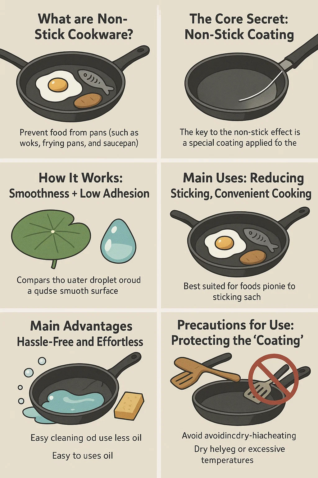 Sederhananya, ini adalah panci dan wajan (seperti wajan, penggorengan, dan panci) yang permukaan bagian dalamnya telah diberi perlakuan khusus untuk mencegah makanan menempel ke dasar saat dimasak. Saat Anda menumis, menggoreng telur, atau menggoreng ikan, makanan tidak akan mudah menempel di dasar wajan.