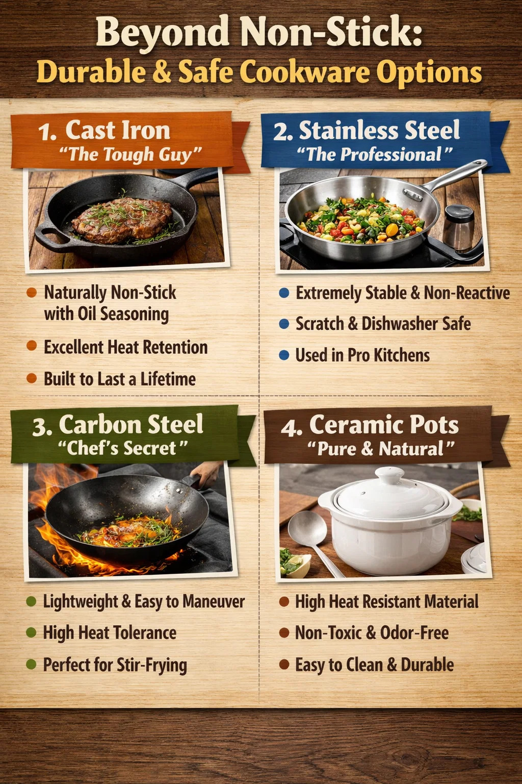 Meskipun modern peralatan masak anti lengket aman dalam penggunaan normal, jika Anda mencari peralatan masak yang benar-benar bebas rasa khawatir, tanpa khawatir lapisan terkelupas atau masalah suhu tinggi, ada beberapa alternatif yang lebih kuat dan andal.