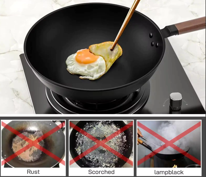 Panci besi tradisional: Permukaannya kasar, dan minyak perlu mengisi pori -pori untuk mencegah lengket, sehingga lebih banyak minyak diperlukan.