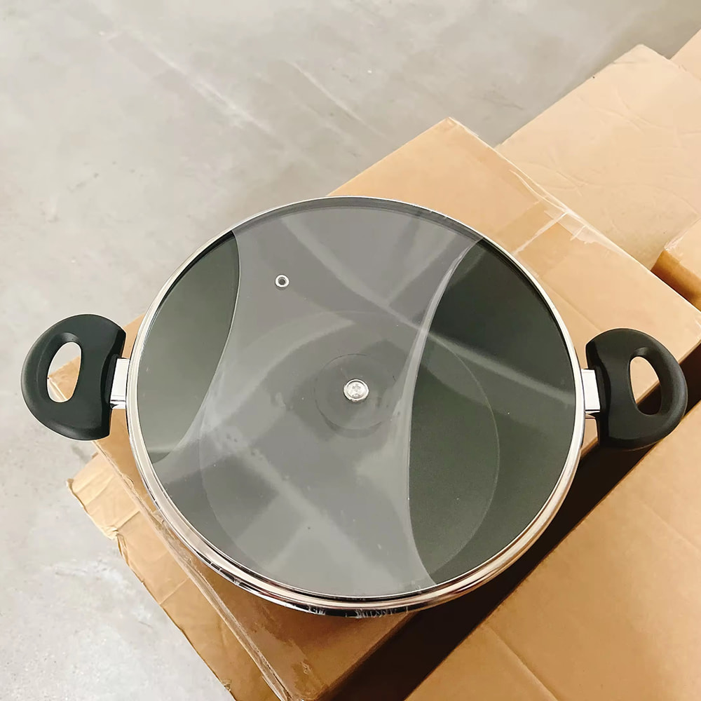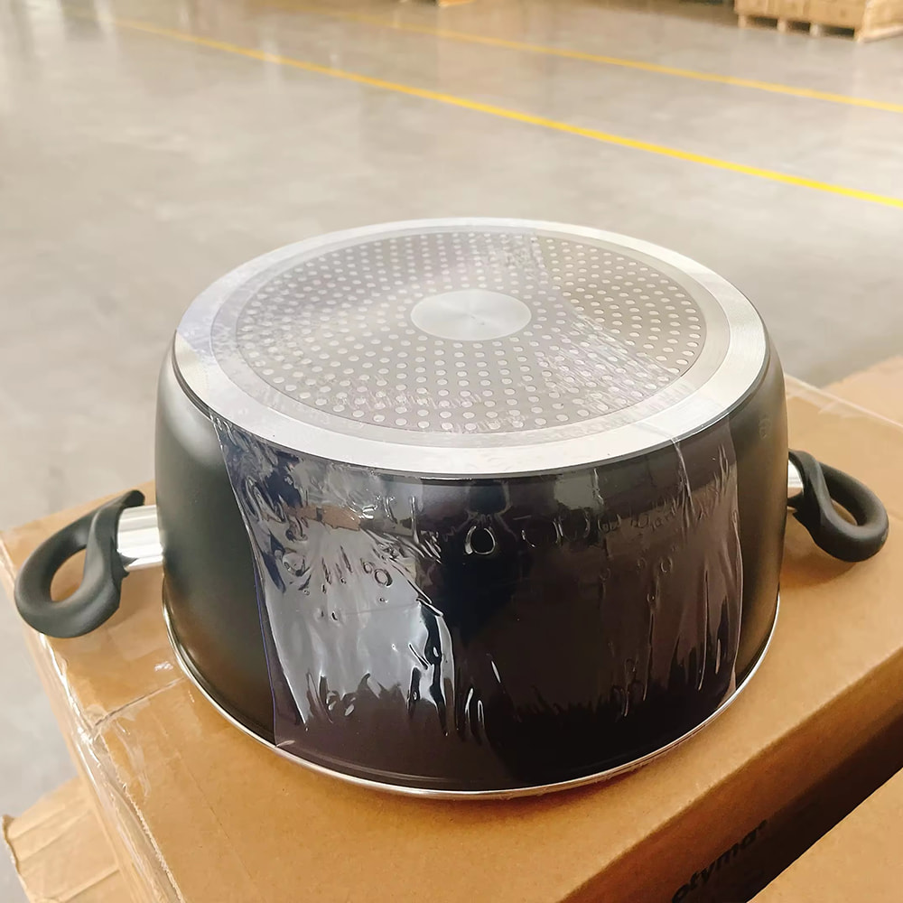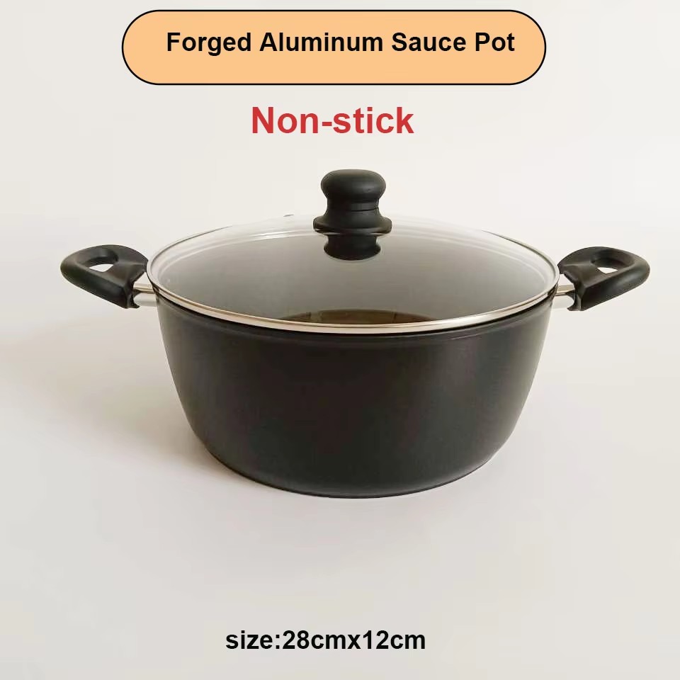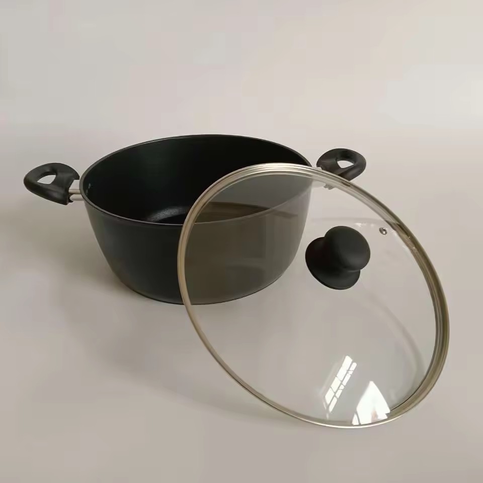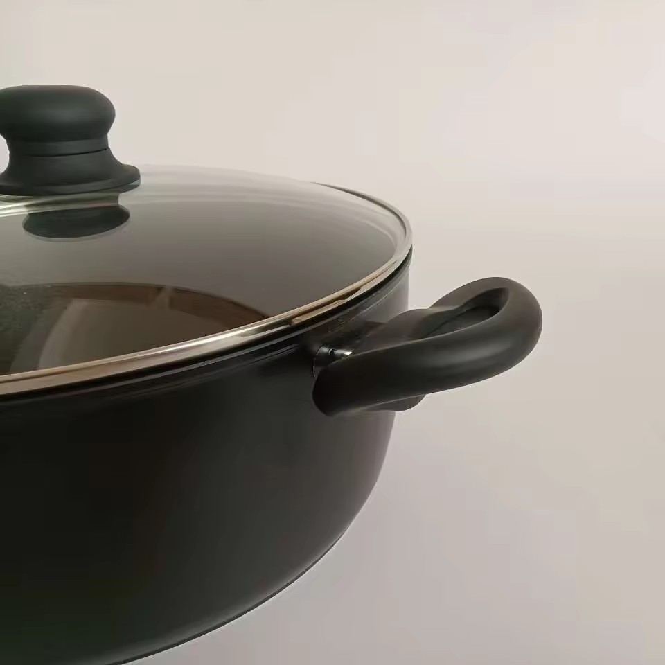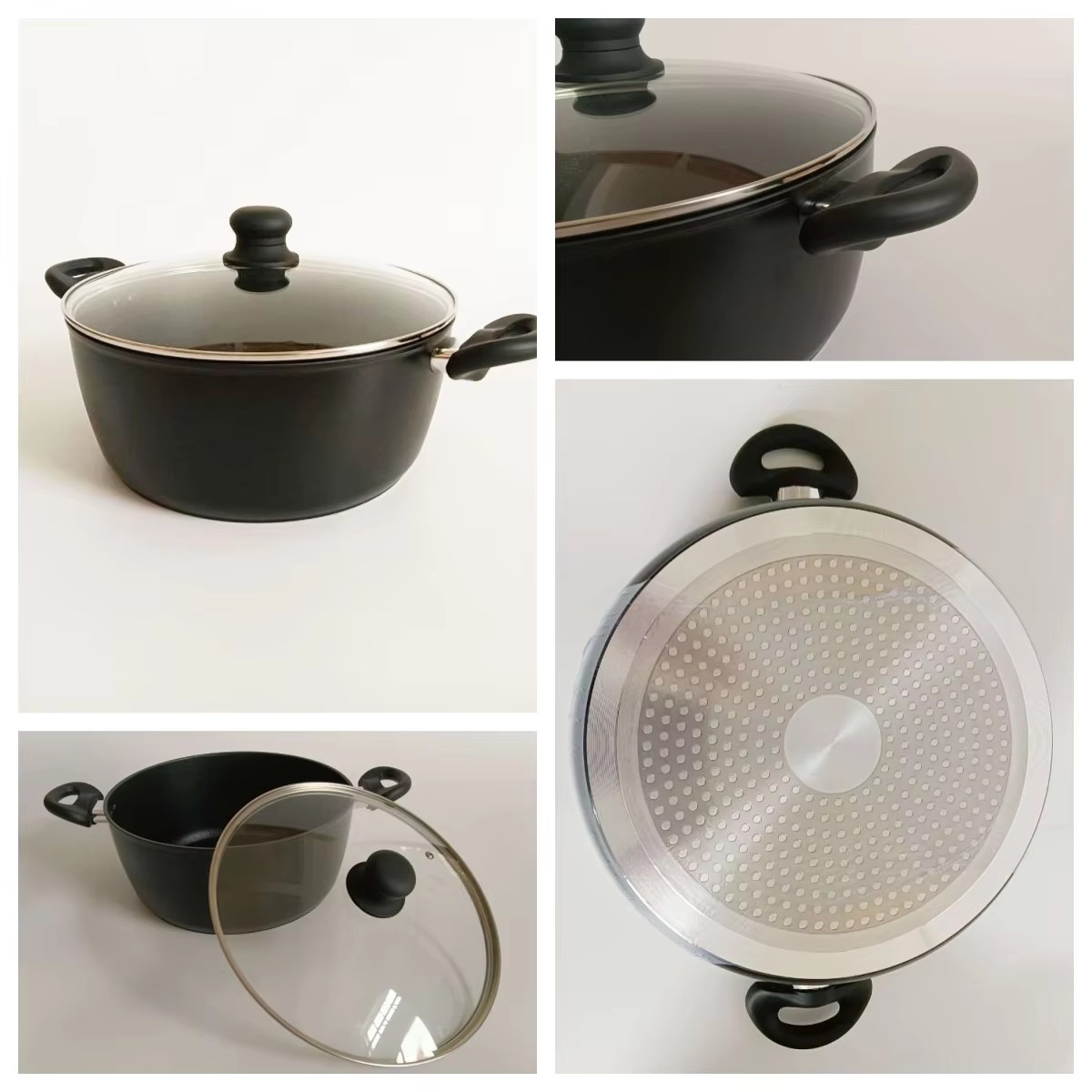Rumah / Produk / Basi / Panci dan Wajan Dapur Aluminium Peralatan Masak Anti Lengket Set Panci Sup Hitam dengan Tutup Kaca