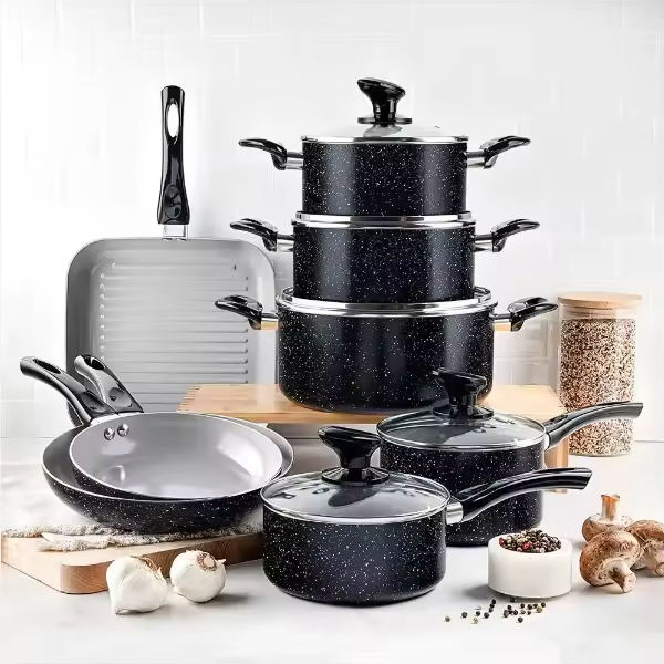 Set Peralatan Masak Harga Kompetitif dengan Panci Panggangan 13 Buah Set Peralatan Masak Bermerek Set Peralatan Masak Berlapis Granit Ganda